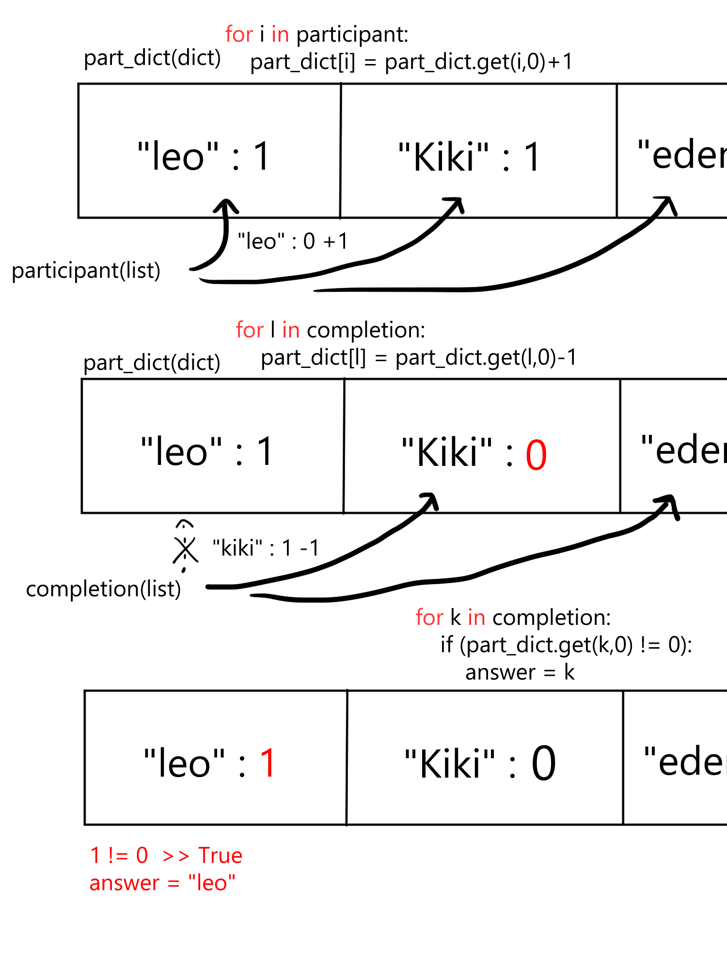 3. 결론적으로 completion 리스트에 이름이 있다면 그 value는 0이 되어야 한다. (동명이인도 마찬가지. 만약 동명이인이 2명이라면 1을 수행하면서 2의 값을 가졌을것이다. 따라서 그 동명이인의 수 만큼 completion 리스트에 이름이 있어야지만 0이 된다. 결국엔 하나가 러닝에 성공했든 둘이 성공했든 계산엔 문제가 없다.)