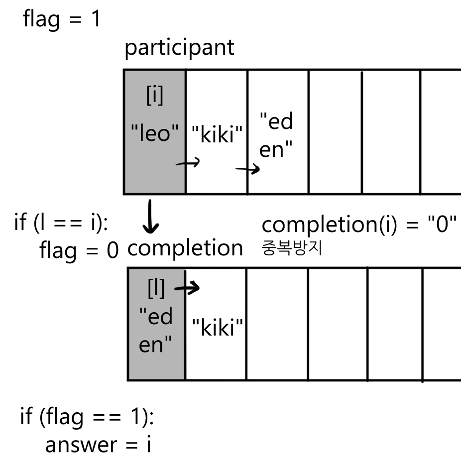 수많은 마라톤 선수들이 마라톤에 참여하였습니다. 단 한 명의 선수를 제외하고는 모든 선수가 마라톤을 완주하였습니다. 마라톤에 참여한 선수들의 이름이 담긴 배열 participant와 완주한 선수