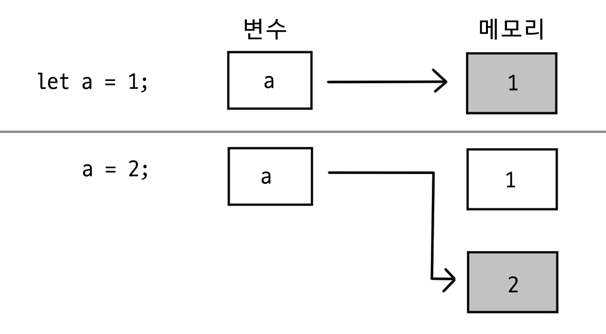 - 원시 타입은 변경할 수 없는 값을 가지기 때문에, 재할당을 하더라도 기존 값이 변하는 게 아니라
