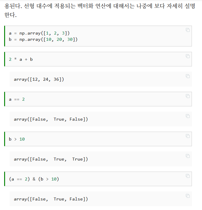 배열 객체는 배열의 각 원소에 대한 반복 연산을 하나의 명령어로 처리하는 벡터화 연산