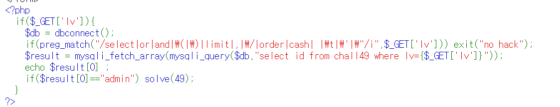 $result = mysqli_fetch_array(mysqli_query($db,"select id from chall49 where lv={$_GET['lv']}"));
