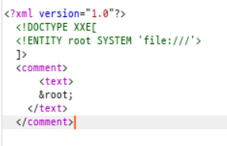 <!ENTITY root SYSTEM 'file:///'> *외부의 경로를 가진 root(이곳부터 파싱을 시작한다던데 이 공격에선 이름을 무엇으로 하든 상관이 없다.) **SYSTEM 키워드는 외부 엔티티를 선언하기 위해 사용하는 키워드(요소의 타입)